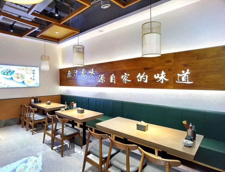 獨(dú)厚麻食飯店定制的家具包含實(shí)木餐桌椅以及餐廳卡座,安裝之后整體效果特別的舒服,給前來(lái)就餐的食客營(yíng)造出一個(gè)輕松愉快的環(huán)境。接下來(lái),我給大家分享幾張由西安餐桌椅廠家博菲克家具項(xiàng)目經(jīng)理拍攝的現(xiàn)場(chǎng)實(shí)拍效果圖,好不好一看便知。