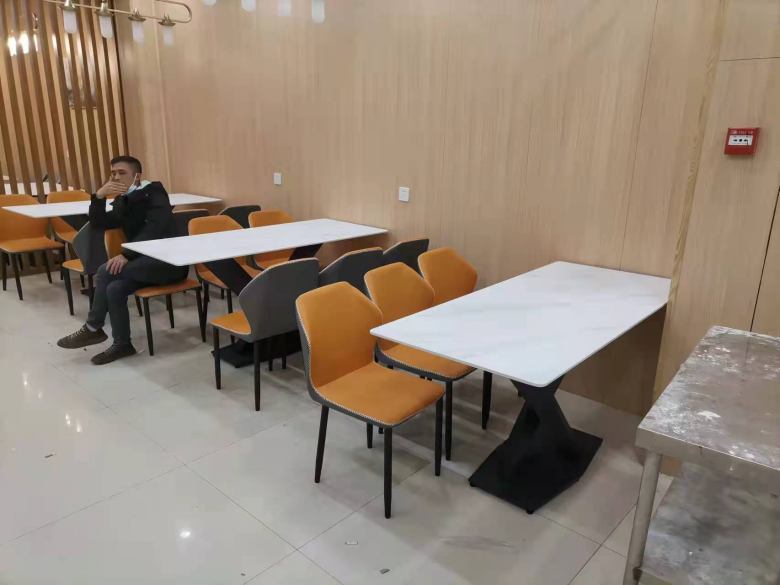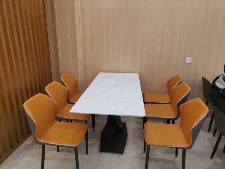 當(dāng)客戶踏入展廳后不久,便中意上了一款巖板餐桌和輕奢風(fēng)格的餐椅,兩者搭配在一起既具有現(xiàn)代簡約感又精致時(shí)尚,更突出的優(yōu)點(diǎn)便是巖板桌面不吸油污,表明的油漬用濕抹布輕輕擦拭就能去除,很好打理。