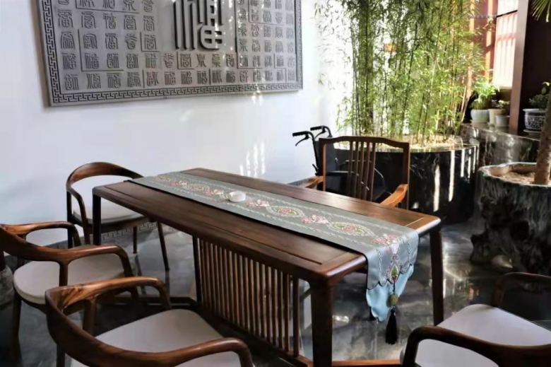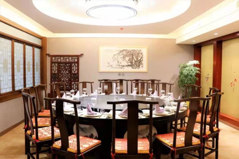 經(jīng)過(guò)多次溝通和討論,神木乾茂飯店宴會(huì)廳桌椅均采用中式風(fēng)格,餐椅選用官帽椅,整體實(shí)木結(jié)構(gòu)榫卯工藝。餐桌方面,為了考慮實(shí)用性和控制成本預(yù)算,最終敲定使用帶玻璃轉(zhuǎn)盤(pán)的圓桌,另外,根據(jù)空間的需要,在部分休息接待室配套了幾套茶臺(tái)供顧客喝茶使用。
