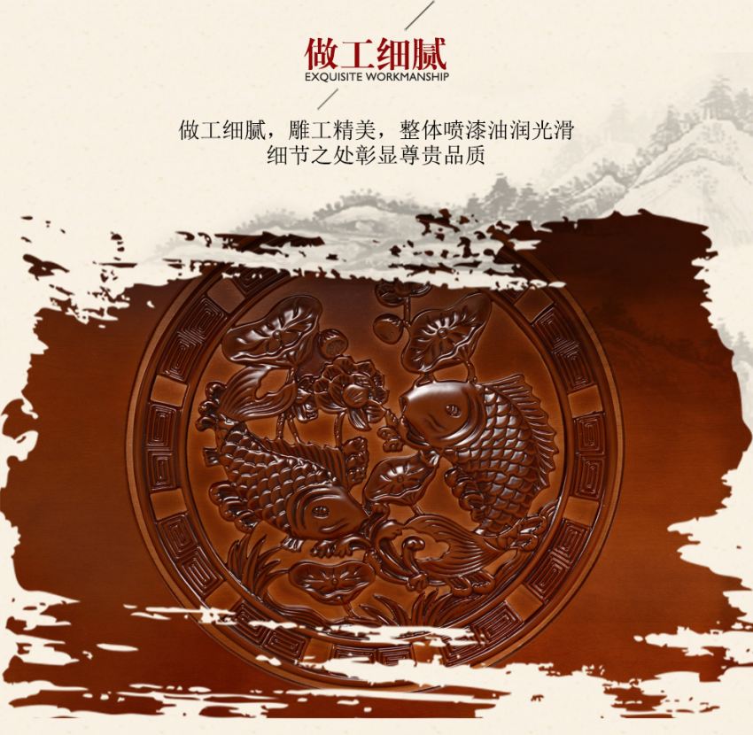 寶雞電動大圓餐桌采用現(xiàn)代中式風格設計,雙魚圖案形象逼真栩栩如生,寓意吉祥如意,年年有余。即是實用的餐桌家具用品,亦是彰顯品位的藝術品。大圓桌整體采用環(huán)保油漆,觸感油潤光滑,硬度高,防刮耐燙。天然原木紋理更加細膩,隨時突出自然氣息。主材料選用