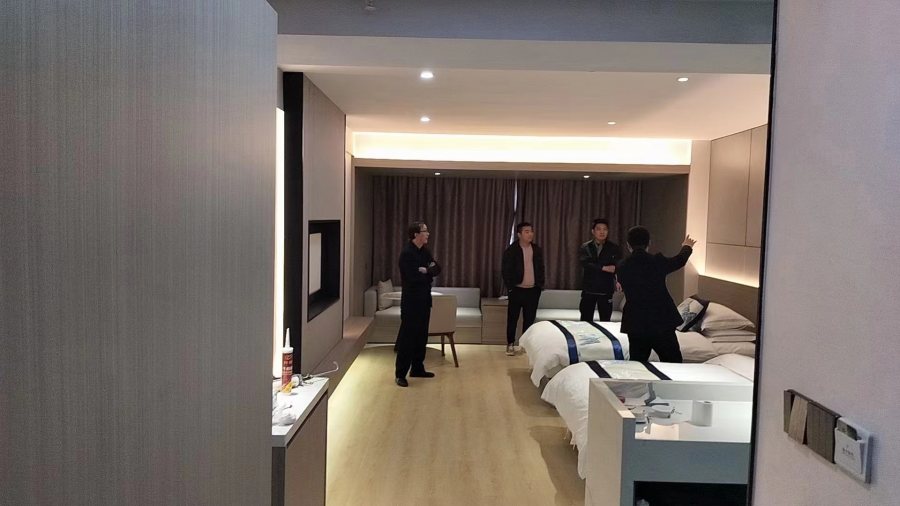 該項(xiàng)目的酒店客房委托西安博菲克集團(tuán)管理有限公司所屬的設(shè)計(jì)部、裝修部、家具廠總包負(fù)責(zé),設(shè)計(jì)部出客房效果圖,裝修部門抵達(dá)子洲縣進(jìn)行施工,酒店家具廠根據(jù)效果圖制作家具,一站式服務(wù),軟硬裝一方全包,無(wú)扯皮現(xiàn)象,客戶只等驗(yàn)收。